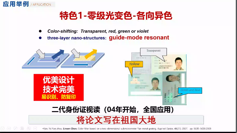 在我国二代身份证防伪技术进行全球招标过程中,陈老师团队通过不懈努力并最终脱颖而出,仅在2年时间就实现了从理论到工程化。在研发过程中,团队践行了将论文写在祖国大地上,写在每个国人口袋里的价值观,极大增强了成员的自信心和自豪感。微纳结构在二代身份证应用的典型工程案例,告诉了同学们开创性思维、工程能力的重要性。