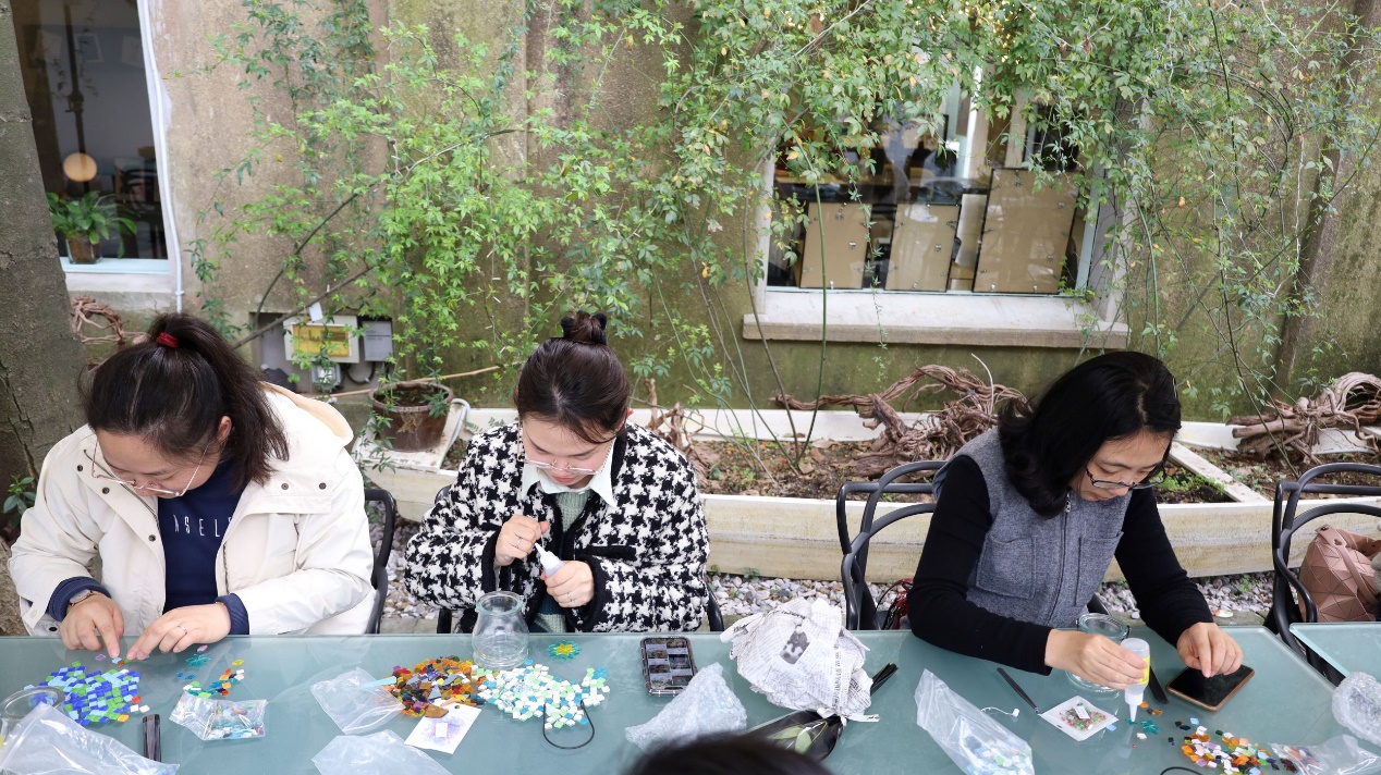 午后的休闲手作活动中,女教职工们在认真听取工作人员介绍马赛克灯的DIY方法后亲手实践,发挥各自的艺术感和创造力,在灯具中添加色彩缤纷、形式多样的元素。大家一边制作一边讨论,活动现场到处洋溢着欢快和谐的氛围。