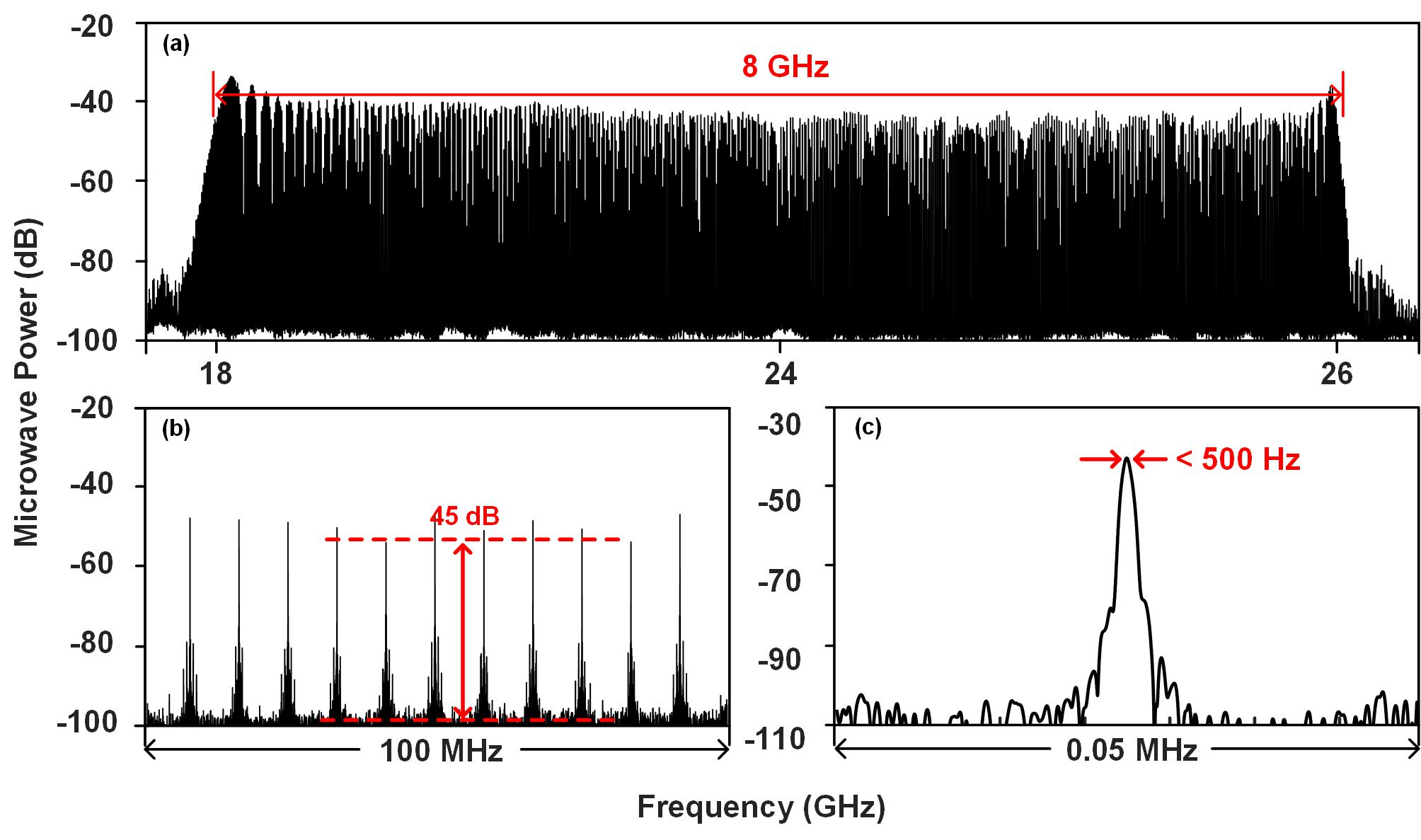 论文展现了课题组在微波频率梳信号产生方面的重要进展:实验中成功产生了K波段微波频率梳信号,其带宽为8 GHz (18 GHz-26 GHz),提供的梳齿分量超过940根,梳齿对比度为45 dB,梳齿线宽为500 Hz,且所有的梳齿分量都具有极好的相位噪声性能。典型值为-93.23 dBc/Hz @10-kHz offset。该工作得到了国家自然科学基金(62001317, 62004135)和江苏省自然科学基金(BK20200855)等项目的支持。