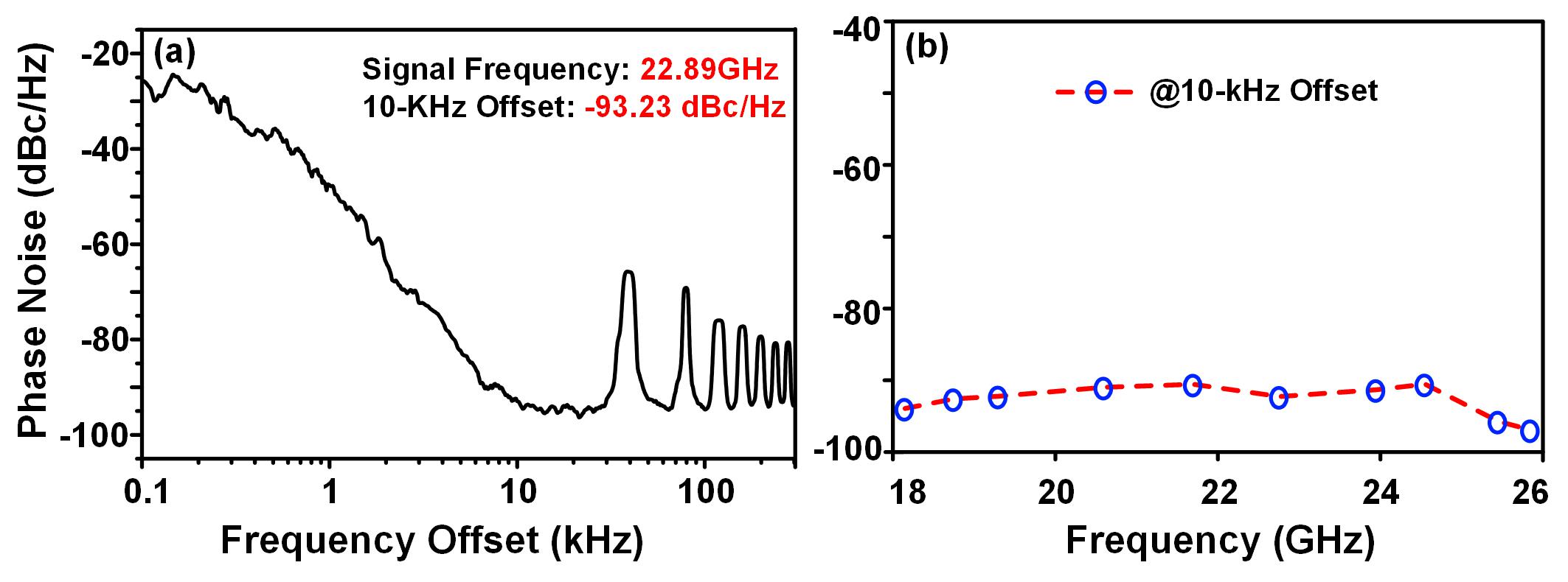 下图依次为:K波段微波频率梳的频谱图和梳齿分量的相位噪声测量结果。