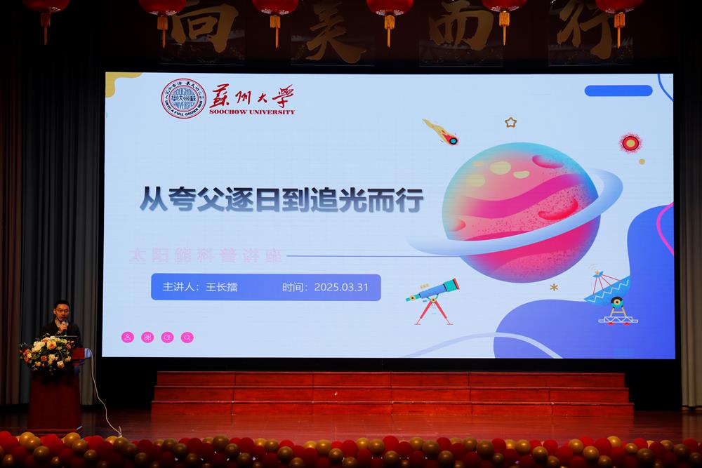 随后,王长擂为初二年级的学生们带来一场题为《从夸父逐日到追光而行——太阳能科普讲座》。他从夸父逐日的神话故事引入,介绍了太阳能的广泛应用,深入浅出地讲解了光伏的基本原理、应用场景、发展历程和未来图景,鼓励大家积极投身科技实践活动,养成善于思考、善于发现、善于探究的科学精神,用科技的力量为生活增添色彩。讲座现场氛围热烈,学生们听得津津有味,不时发出阵阵掌声。