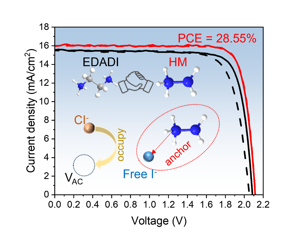 Abstract:Low-bandgap (LBG) mixed tin-lead (SnPb) perovskite solar cells (PSCs) suffer from inferior performance due to their high defect density. Conventionally, ethylenediammonium diiodide (EDADI) is used as a surface passivator to reduce defects and improve device photovoltaic performance, but it introduces severe hysteresis caused by excessive mobilized ions at the top interface. Here, we report a mobile ion suppressing strategy of using hydrazine monohydrochloride (HM) as a bulk passivator to anchor the free ions in LBG perovskites. The protonated hydrazine (N2H5+) of HM formed hydrogen bonds with iodine (I–) ions, while the chloride (Cl–) ions occupied the I– vacancies, collectively impeding the migration of I– and thus mitigating the ion movement-induced hysteresis that arose from EDADI usage. The synergistic strategy of HM doping and EDADI post-treatment significantly suppresses the oxidation of Sn2+, decreases trap density, and inhibits rapid crystallization of perovskite. Consequently, we achieved a champion efficiency of 23.21% for LBG PSCs. Integrating these cells with wide-bandgap PSCs into all-perovskite tandem solar cells yields a high efficiency of 28.55% (certified 28.31%) with negligible hysteresis.