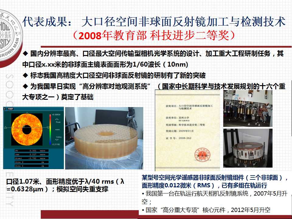 大口径空间非球面反射镜加工与检测技术(2008年教育部 科技进步二等奖)