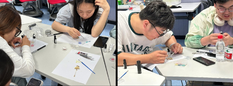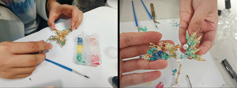 经过一个多小时的努力,一枚枚饱含创意的螺钿胸针成功诞生。这些胸针风格各异,有的镶嵌着蝴蝶图案,寓意着破茧成蝶、追求梦想;有的则镶嵌着花鸟图案,展现了自然界的和谐之美。每一枚胸针都凝聚着大家的独特创意与对美的理解,也注入了对传承传统文化的决心。