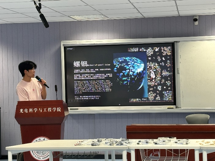 活动伊始,2023级智能测控工程2团支部副书记朱炳昀向大家介绍了本次活动的意义和目的,强调了非遗文化传承的重要性。随后,为团员们详细讲解了螺钿工艺的历史渊源。从唐代螺钿漆器的辉煌,到明清时期螺钿家具的精美绝伦,一段段历史故事娓娓道来。最后,大家一同观看螺钿工艺视频,详细了解了螺钿工艺的历史渊源,制作工艺,文化内涵,传承魅力等。