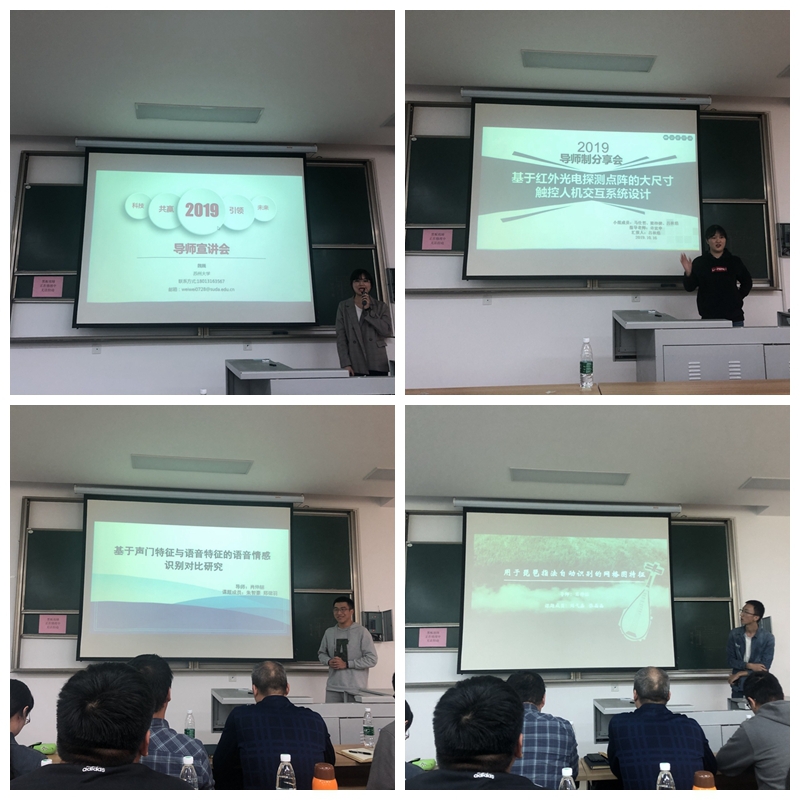 在宣讲环节,各导师制团队代表结合各自参与的科研项目进行了详细介绍和经验分享,现场的同学们认真聆听,气氛热烈。各团队研究面广,专业性强,涉及节能研究、语音情感的识别、病理嗓音的诊断、四轴无人机研究,光伏电云平台研发等方方面面。通过已参与导师制一年的本科生的交流分享,让低年级的同学们了解到了导师们的研究方向和科研成果,对导师团队的科研项目产生了兴趣,也对导师制本身有了更清楚的认识。而教室内展示的科研项目成果板和一些科研成果的实物(如四旋翼无人机,光伏电云平台设备,纸张计数仪器等作品),为本次导师制交流活动营造出了浓厚的学术科研氛围,让同学们对科研实践有了更加直观的了解。