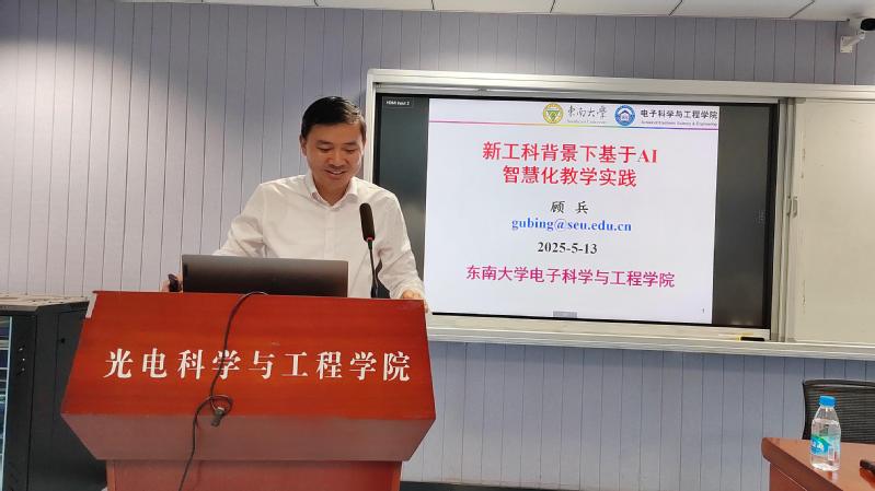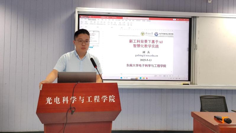 随后,顾兵教授以东南大学电子科学与技术国家一流专业核心课程《现代光学基础》为例,以“新工科背景下基于AI智慧化教学实践”为题,深入浅出地阐述了课程团队如何借助AI技术构建数智化课程,顾兵教授详细介绍了AI智慧化教学在提升教学质量及优化学生学习体验等方面的显著成效,并从东南大学的AI智慧化教学现状、AI技术与课堂教学的深度融合等方面,分享了AI技术赋能课程建设的发展趋势以及个人的宝贵经验与深刻体会。