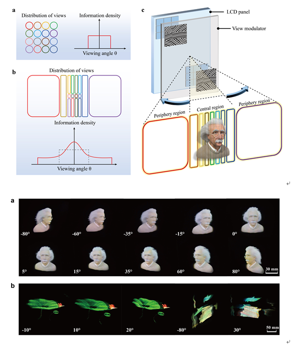 研究人员受人眼视网膜成像策略的启发,提出了一种3D显示的通用方法:即根据观察频率来投射空间上变密度的图像信息。在使用频率高的中间视区,投射密集排布的视角;而在使用频率低的边缘视区,投射稀疏排布的视角。这需要解决以下难题:(1)视角之间的角度间隔需要空间可变;(2)各个视角的光场图案需要精确调制,消除重叠区域,以避免图像串扰;(3)相邻视角间的间隙需要避免,以消除过渡暗区;(4)需要实现大幅面密排微纳结构的高精度制备(5英寸-32英寸)。