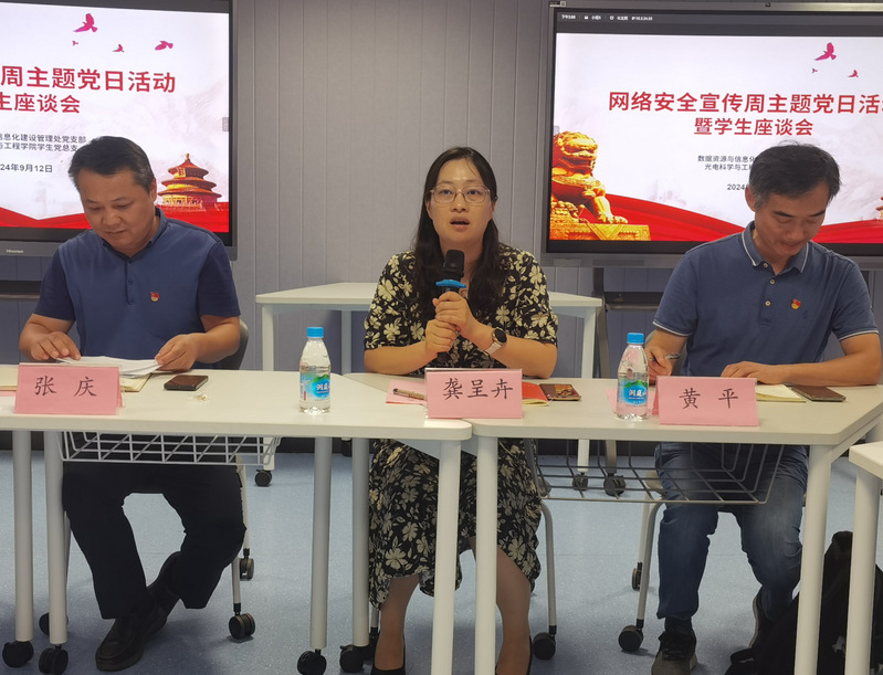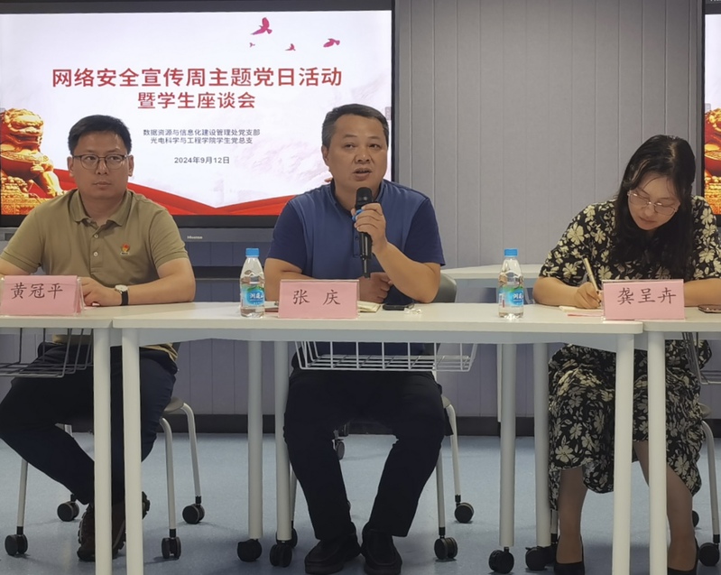 2024年9月12日下午,雷速体育 学生党总支与校数据资源与信息化建设管理处党支部联合开展网络安全宣传周主题党日活动暨学生座谈会。校数据资源与信息化建设管理处党支部书记张庆,雷速体育 党委书记龚呈卉,党委副书记、副院长黄冠平,以及教师党员、学生党员代表参加了本次活动。活动由研究生辅导员黄彦龙主持。