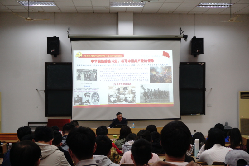 陈建军书记在党课中简明扼要地介绍了中国共产党的党史,向同学们展示了中国共产党带领中国一步步从被欺压瓜分到如今位列全球强国的历程。他强调,中国共产党的初心是“为中国人民谋幸福,中华民族谋复兴”。而作为新时代的新青年,同学们需要知道自己的初心、坚守自己的初心并为之不懈努力。谈及新时代对青年的要求时,陈书记介绍了光电雷速体育 优秀的科学报国人才,并通过潘院士的事例,教导同学们要学习身边的楷模,学习老一辈科学家的科学报国精神,努力成为中华民族复兴的中流砥柱。