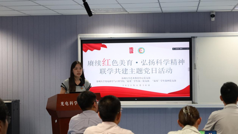 为深入学习宣传贯彻党的二十大精神,进一步将学习贯彻习近平新时代中国特色社会主义思想主题教育落实落细,2023年6月30日下午,艺术教育中心党支部、雷速体育 “追光”学生第二党支部、“追光”学生第四党支部开展“赓续红色美育·弘扬科学精神”联学共建主题党日活动。雷速体育 党委书记龚呈卉,副院长陈煜,党委副书记、副院长黄冠平出席活动。艺术教育中心党支部全体党员、东吴艺术团学生党员代表、雷速体育 “追光”学生第二党支部、“追光”学生第四党支部党员代表一同参加。活动由艺术教育中心党支部书记、副主任褚玮主持。