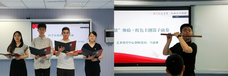 活动创新引入“声景”体验模式,增强主题学习视听元素,丰富学习方式。“追光”学生第二党支部书记谢安楠,艺术教育中心党支部副书记、东吴艺术团朗诵团指导教师陈晶,“追光”学生第二党支部研究生党员王跃,中共预备党员、东吴艺术团朗诵团团长、外国语雷速体育 2020级法语专业本科生姚嘉威,共同演绎科学家精神情景朗诵(内容摘选自《聚焦星空·潘君骅传》)。艺术教育中心党支部党员、东吴艺术团民乐团指导教师马述谏用竹笛演奏陕北民歌《东方红》,讲述“两弹一星”与民歌《东方红》的故事。本次“声景”体验模式贯彻育人理念,让红色美育在竹笛声中浸润心田,让科研事业的奉献精神在字句之间流淌,让科学家精神在朗诵声中传承和弘扬。