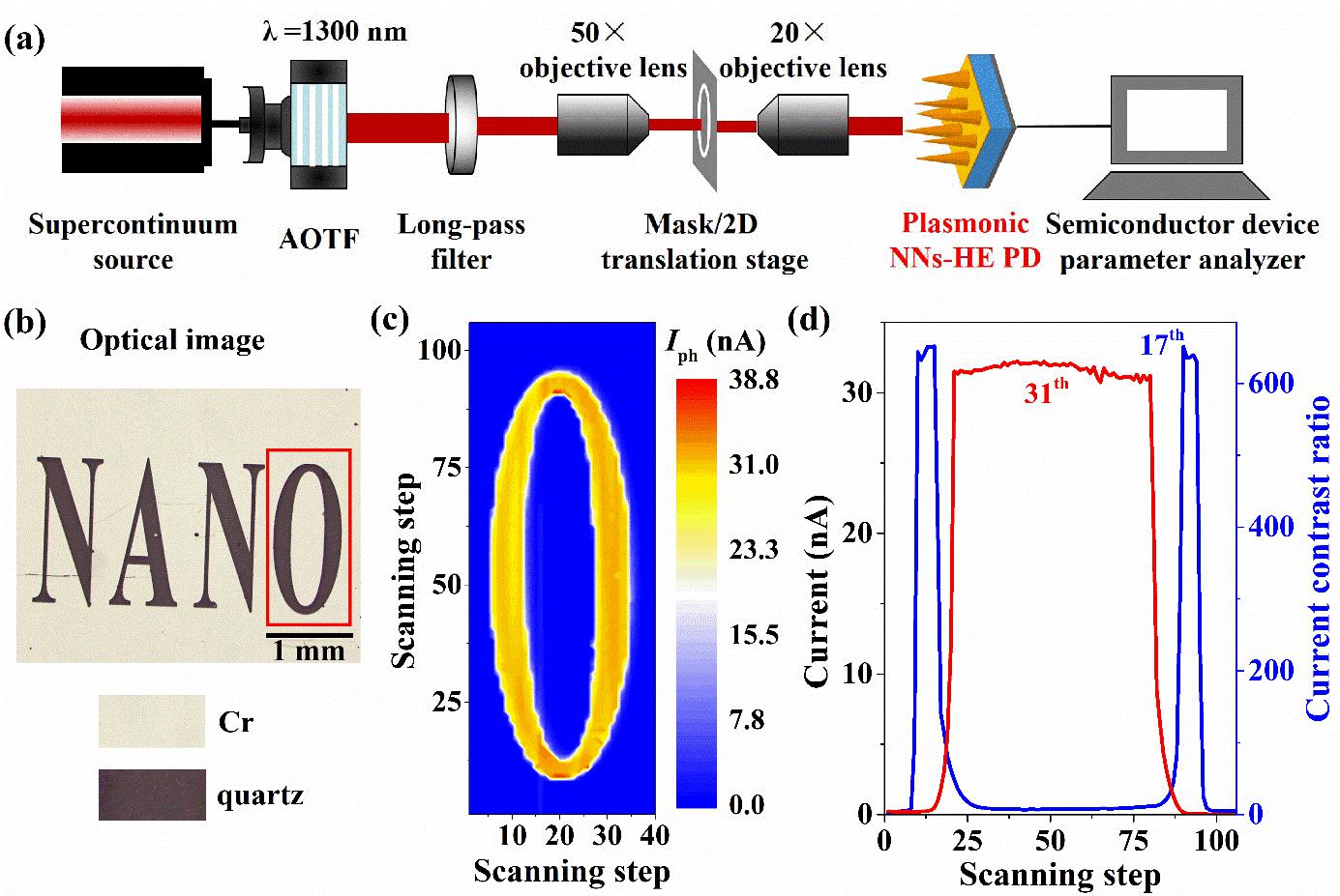 摘要:Hot electron photodetection based on metallic nanostructures is attracting significant attention due to its potential to overcome the limitation of the traditional semiconductor bandgap. To enable efficient hot electron photodetection for practical applications, it is necessary to achieve broadband perfect light absorption and strong near-field enhancement simultaneously within extremely thin plasmonic nanostructures using cost-effective fabrication techniques. In this study, we demonstrate an ultra-high optical absorption (up to 97.3% in average across the spectral range of 1200−2400 nm) in the ultrathin plasmonic nanoneedle arrays (NNs) with thickness of 10 nm, based on a carefully designed all-wet metal-assisted chemical etching process. The significant absorption can be attributed to the combination of localized surface plasmons, propagating surface plasmons and waveguide modes. The resulting efficient hot electron generation, transport and injection at the nanoscale apex of the nanoneedles facilitates the photodetector to achieve a record low noise equivalent power (NEP) of 4.4 10−12 W Hz−0.5 at the wavelength of 1300 nm, to the best of our knowledge. We elucidate the hot-electron generation and injection process through a transport model based on a Monte Carlo approach, which quantitatively matches the experimental data. The measured external quantum efficiency is beyond the limit that can be achieved under a planar configuration with a film thickness of only 5 nm. We further integrate the photodetector into a light imaging system, as a demonstration of the exceptional imaging capabilities at the near-IR regime. The study presents a lithography-free, scalable, and cost-effective approach to enhance hot electron photodetection, with promising prospects for future imaging systems.