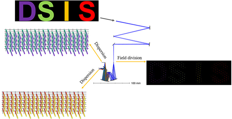 下图依次为:成像光谱仪的光学布局图、双通道快照式成像光谱仪的仿真实验原理示意图。