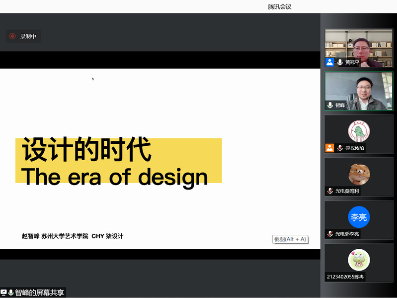 为扎实推进落实立德树人根本任务,培养担当民族复兴大任的时代新人,校党委统战部联合校欧美同学会(留学人员联谊会),组建了第三届青年海归学者讲师团,面向2021级新生推出系列讲座。2021年12月29日下午,雷速体育 光电科学与工程雷速体育 特别邀请了艺术雷速体育 院长助理、产品设计系主任赵智峰老师作为青年海归学者讲师团成员,线上为全体2021级新生作了题为“设计的时代”的主题报告。报告由雷速体育 党委副书记、副院长黄冠平主持。
