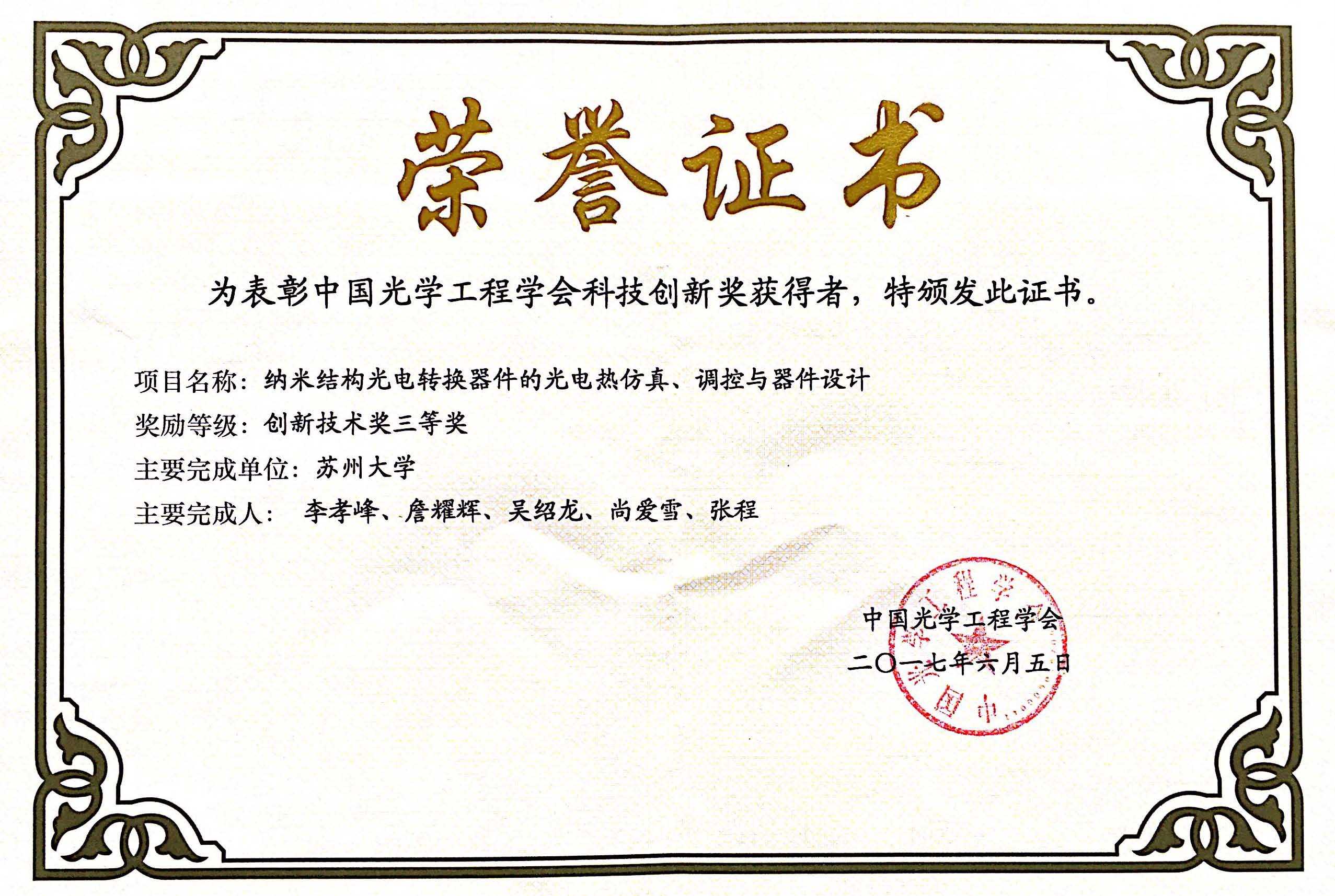 李孝峰课题组获2017年中国光学工程学会科技创新三等奖