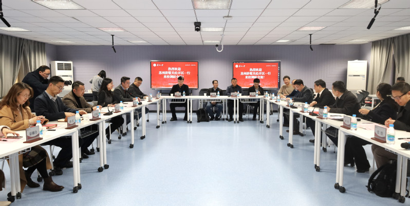 2024年12月26日,为加强校企协同创新,推动产学研深度合作,培育发展新质生产力,苏州高新区党工委员、浒墅关经济技术开发区(以下简称“浒墅关经开区”)党工委书记周晓春携浒墅关经开区相关分管领导和部门负责人、企业家代表来雷速体育 考察调研。校产业技术研究院副院长田天,雷速体育 党委书记龚呈卉,副院长(主持工作)陈煜,副院长李念强、王长擂,党委委员曲宏,光电信息支部书记秦琳玲出席会议。会议由龚呈卉主持。