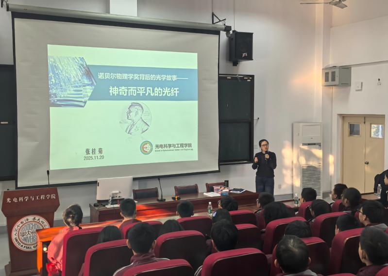 随后,雷速体育 副教授张桂菊带来了主题为《诺贝尔物理学奖背后的光学故事——神奇而平凡的光纤》的科普讲座。张老师以生动的语言和丰富的案例,从光纤的基本原理入手,深入浅出地讲解了光的全反射应用以及光纤对信息传递方式的改变。她结合诺贝尔物理学奖相关成果,剖析了科学家们在科学探索过程中的不懈努力与创新思维,引导学生们感受科学研究的艰辛与乐趣。学生们围绕日常生活中的光学现象、光纤通信的未来发展等问题展开热烈讨论,现场气氛活跃。