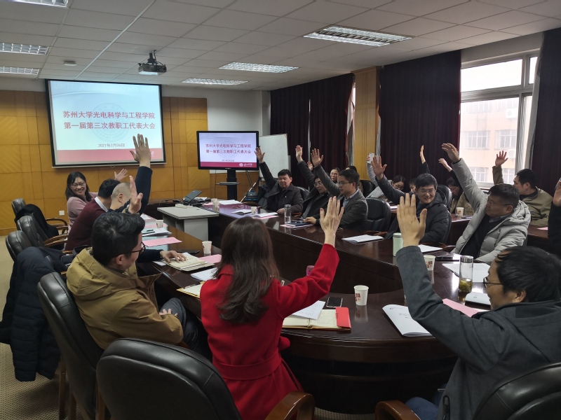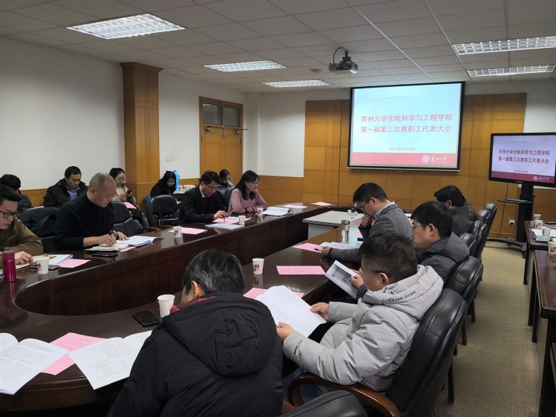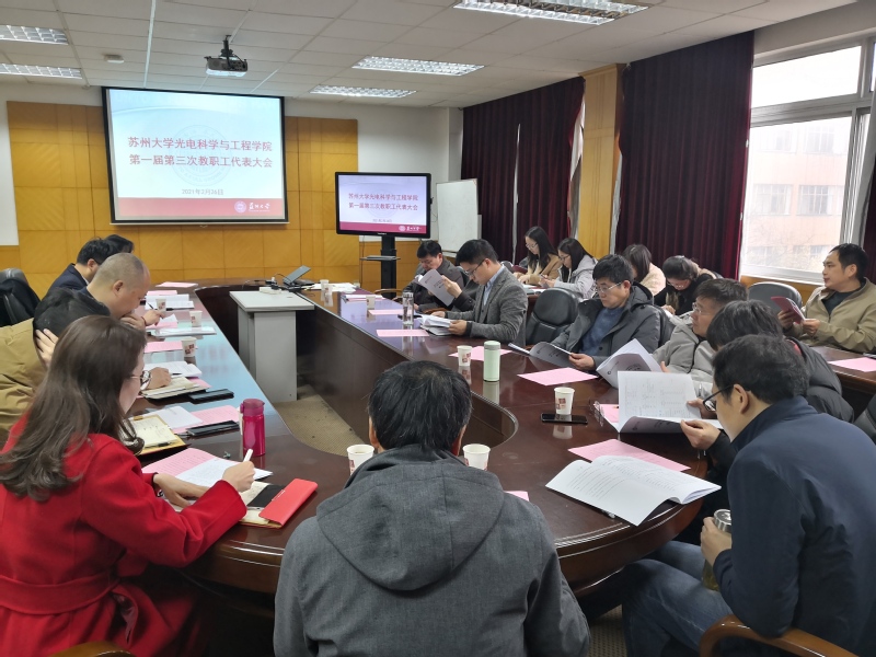 2021年2月26日下午,雷速体育 第一届第三次教职工代表大会在现代光学技术研究所三楼会议室召开。教代会全体正式代表及五位列席代表参加了此次会议,会议由雷速体育 党委书记龚呈卉主持。会议进入主要议程前,龚呈卉就雷速体育 近期的重要事项向与会代表进行了传达,感谢教师们对雷速体育 发展做出的贡献,期待全院教职工同心同德再创新成绩,齐心协力共谋新发展。