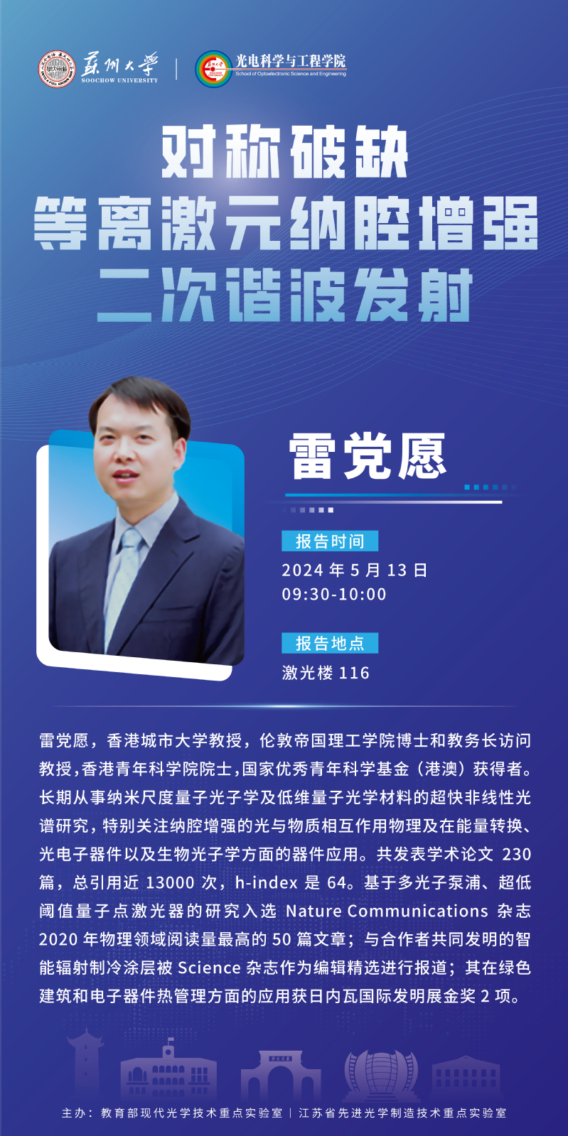 学术报告:对称破缺等离激元纳腔增强二次谐波发射