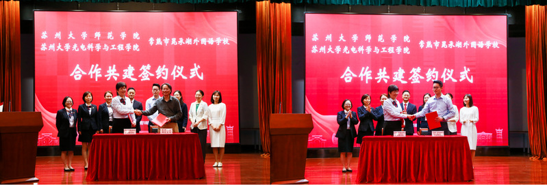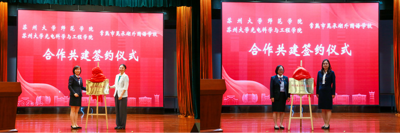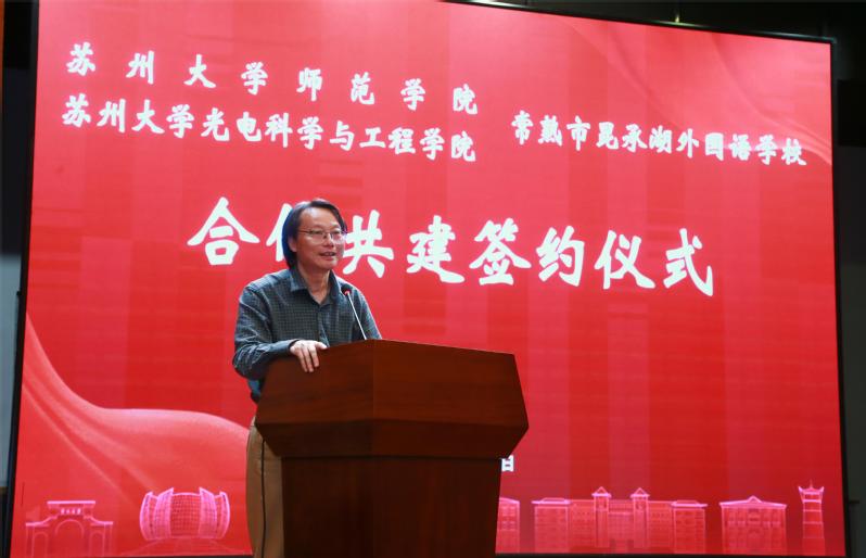 5月18日,雷速体育 师范雷速体育 、雷速体育 与常熟昆承湖外国语雷速体育 合作共建签约仪式在敬贤堂隆重举行。师范雷速体育 院长兼基础教育管理办公室主任陈国安、副院长张佳伟,雷速体育 党委书记龚呈卉、副院长陈煜、教务与科研办公室主任王晴、光电信息系副主任秦琳玲,常熟昆承湖外国语雷速体育 总校长顾苏云及相关领导、雷速体育 家委会代表、学生及家长代表出席本次活动,仪式由王晴主持。