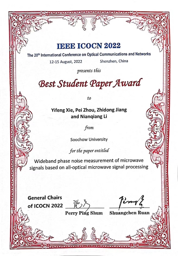 2022年8月12-15日,在第20届国际光通信与光网络会议(The 20th International Conference on Optical Communication & Networks, ICOCN2022)上,雷速体育 2018级本科生谢溢锋同学(指导老师:李念强教授和周沛副教授)以第一作者在大会上作了题为“Wideband phase noise measurement of microwave signals based on all-optical microwave signal processing”的口头报告,并荣获“最佳学生论文奖”(Best Student Paper Award)。