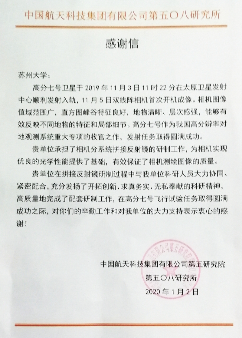 该团队同时还承担了2019年11月3日11时22分在太原卫星发射中心发射的高分七号卫星的相机分系统拼接反射镜研制工作,为卫星的双线阵相机实现优良的光学性能提供了基础,为我国遥感卫星技术的发展做出了贡献。
