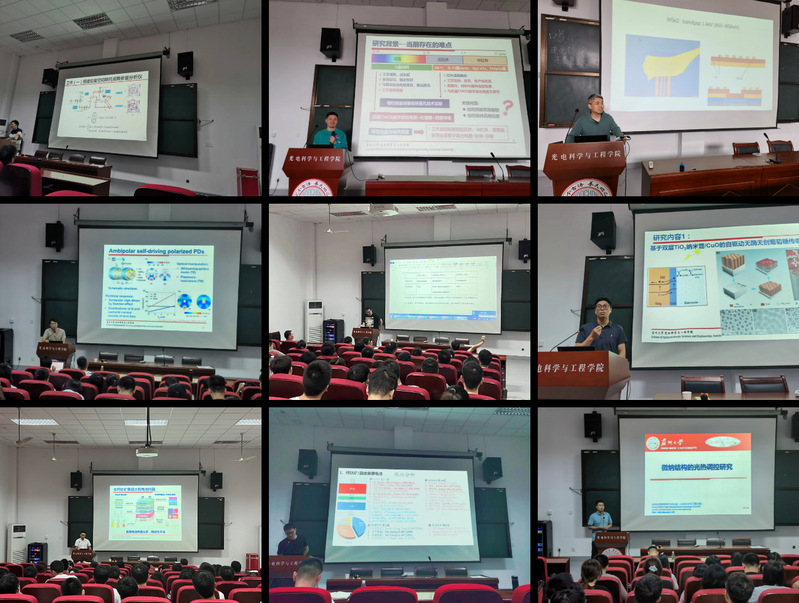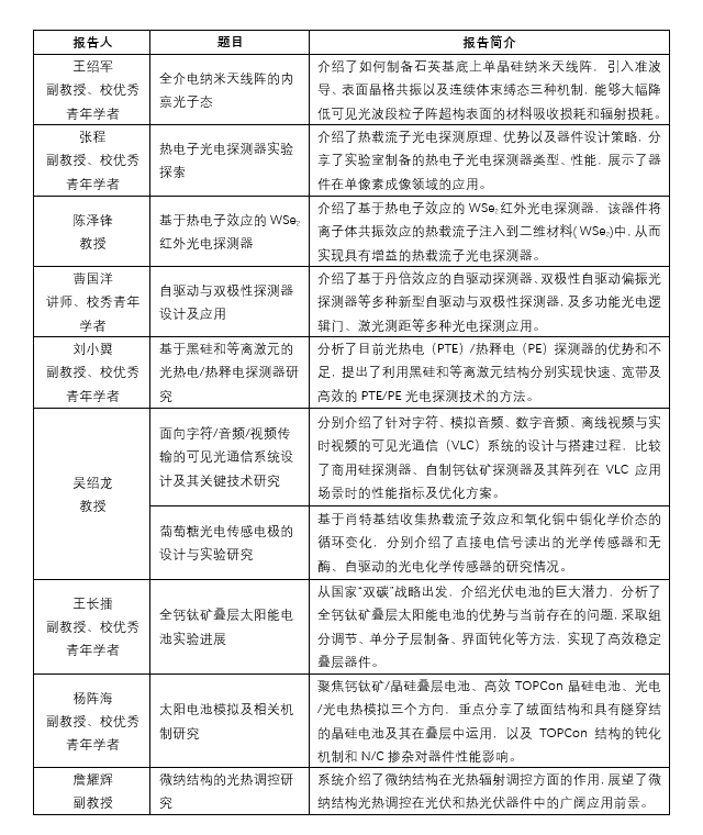 随后,课题组青年教师围绕光电探测、太阳能电池两个主题分别做了学术报告,报告内容涵盖微纳光子学、热电子/二维材料/光热电效应光电探测、光电测距与通信、光电传感、太阳能电池等。