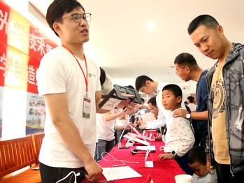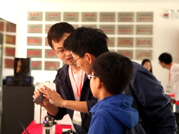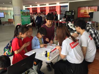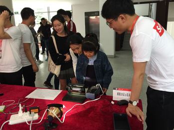 高倍率体视显微镜,3D打印机、智能视觉机械手臂、光场照相机等互动体验产品吸引了众多青少年参观者,在志愿者的引导下纷纷自己动手调节显微镜,兴致盎然的询问3D打印机是怎么打印出这些立体小模型的。超级智能终端Visionboard是由实验室自主研发的产业化成果,来自企事业单位参观者对其产生了浓厚的兴趣。