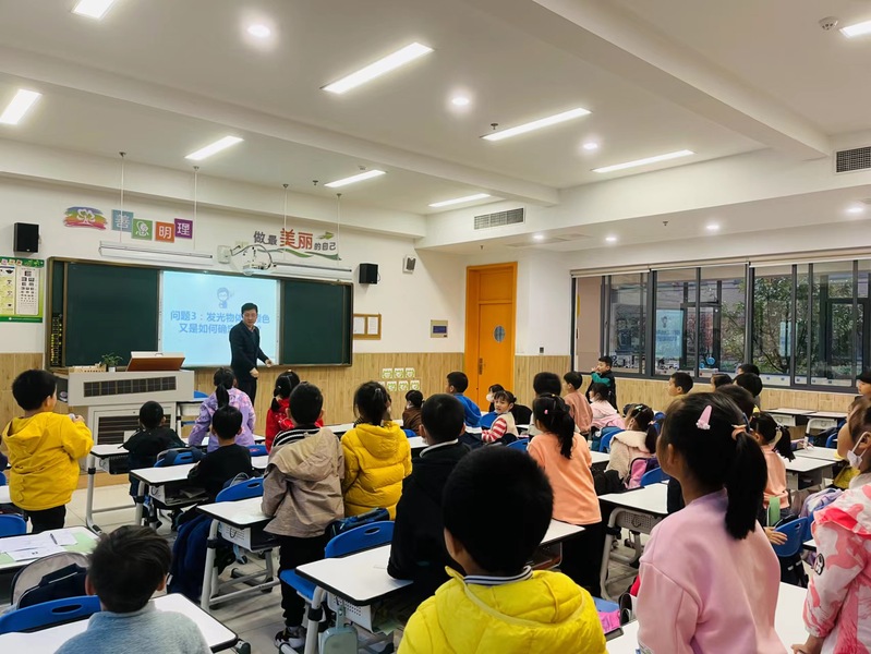 王教授从日出、晚霞、蓝天白云等日常生活中常见的光学现象入手,引导小朋友们思考并探究光的奥秘。随后,王教授结合精心准备的发光材料、彩色板和枫叶,用小朋友们熟悉的游戏和卡通画,详细讲解了太阳光的颜色、光的反射、透射、散射和发射等科学知识。课堂上,小朋友们踊跃发言,积极动手实践光学小实验,不仅收获了有趣的科学知识,更感受到了科技的无穷魅力。