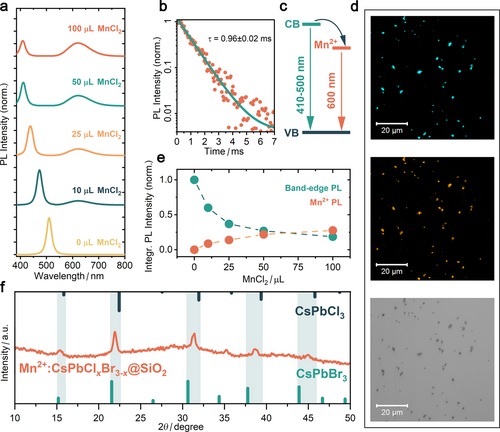 图 2 (a)不同MnCl2前驱体量的Mn2+:CsPbCl3Br3‒x@MS样品的PL谱图。(b)Mn2+:CsPbCl3Br3‒x@MS在600 nm处记录的Mn2+相关发射的PL衰减曲线。实线是衰减常数为0.96±0.02 ms的单指数拟合。(c)Mn2+掺杂的CsPb(Cl/Br)3纳米结构发射示意图。(d)Mn2+:CsPbCl3Br3‒x@MS复合材料的CLSM分析。从上到下:在420—490(带缘相关发射)和580—630(Mn2+相关发射)光谱区域拍摄的发光图像与光学透射光图像重合。(e)积分PL强度对带缘(绿色圆圈)和Mn2+相关(橙色圆圈)发射的MnCl2前驱体量的依赖性。(f)Mn2+:CsPbCl3Br3‒x@MS复合材料与参考的CsPbCl3(PDF# 01-075-0411)和CsPbBr3(PDF# 01-075-0412)立方钙钛矿相(分别为垂直蓝线和绿线)相比获得的XRD图谱。