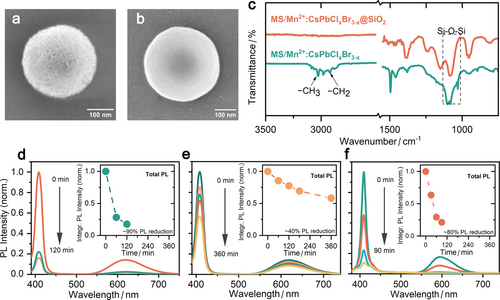 图 3 (a)原始和(b)SiO2包覆的Mn2+:CsPbCl3Br3‒x@MS复合材料的SEM照片。(c)原始(绿色)和SiO2包覆的Mn2+:CsPbCl3Br3‒x@MS(橙色)的FTIR光谱。(d)原始复合材料。(e)SiO2包覆的Mn2+:CsPbCl3Br3‒x@MS复合材料和(f)Mn2+:CsPbCl3Br3‒x纳米晶在介孔硅(MS)中涂覆二氧化硅的PL谱图。插图显示了积分PL强度对时间的相应依赖性。
