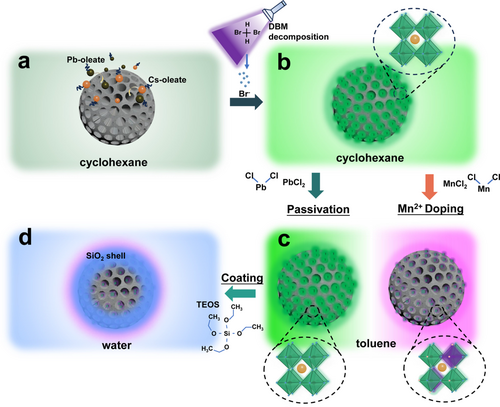 原位后合成处理对在纳米多孔二氧化硅微球中生长的CsPbBr3纳米晶体的光学性能有着明显改善效果。使用含Br‒离子的前驱体进行表面钝化可提高荧光量子产率(PL QY),而使用Mn2+离子的阴离子辅助阳离子掺杂则引入了新的PL带。通过调整母离子量和掺杂时间,可以精确控制铅卤素钙钛矿(LHP)的光学性能,而带有二氧化硅壳的额外涂层增强了它们在极性溶剂中的稳定性,扩大了这些复合材料的潜在应用。