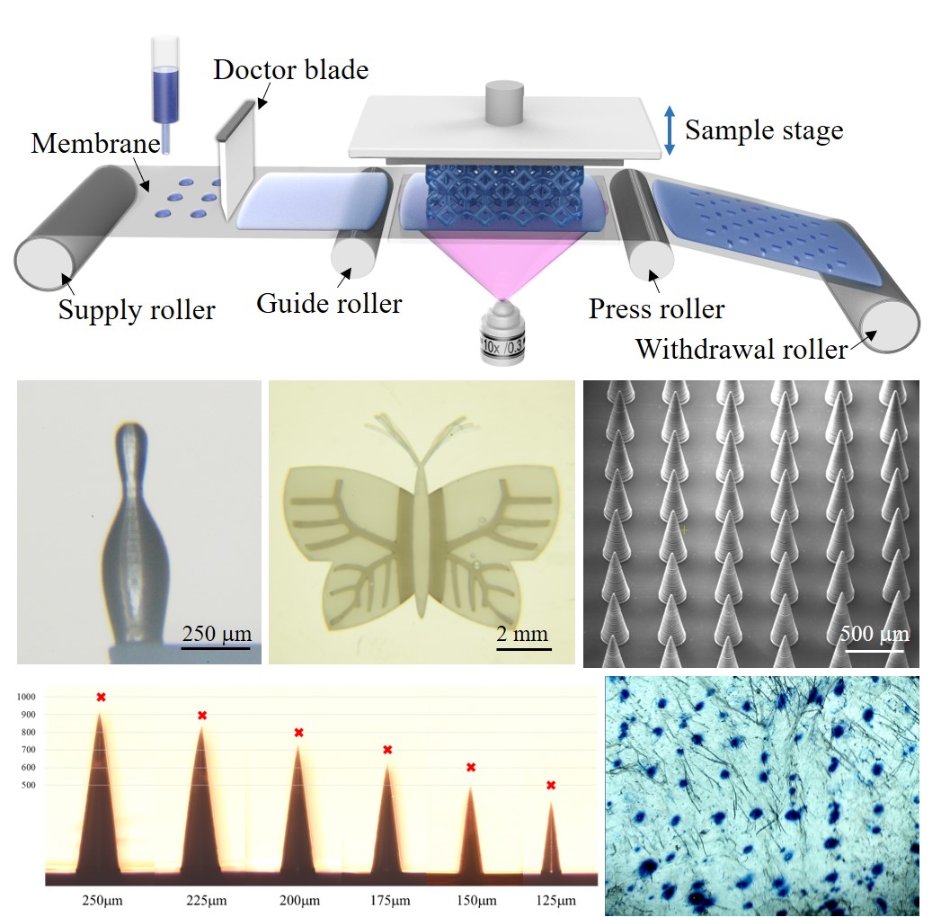 下图依次为:卷对平微纳3D打印系统的工作原理图、高保真微结构器件、不同弹性模量材料构成的仿生蝴蝶、微针阵列SEM、可降解的微针贴片和微针贴片刺入小鼠皮肤的照片。