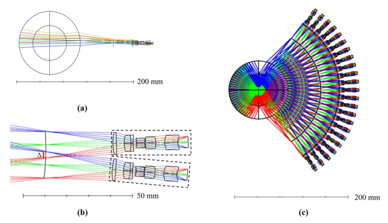 图1 级联结构成像系统的光学布局:(a)单通道光学布局;(b) 次级中继成像光学系统布局(c)全通道光学布局。