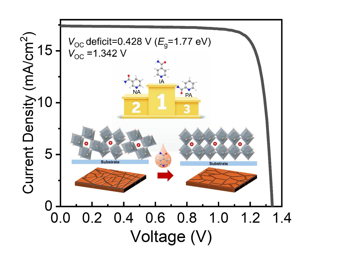 宽带隙钙钛矿太阳能电池在叠层器件中具有良好的应用前景,但存在开路电压低和稳定性较差的问题。本研究将多功能烟酰胺衍生物引入宽带隙钙钛矿太阳能电池,利用羰基、氨基等多种功能基团调控晶体择优取向和光电特性。其中,异烟酰胺(IA)分子的调控效果最佳,这是由于其独特的平面空间结构,可增强结晶动力学和缺陷钝化。将IA掺入宽带隙钙钛矿中可改善(100)晶面的择优取向,降低缺陷态密度,并实现匹配良好的能带排列。本研究实现了高效的1.77 eV宽带隙钙钛矿太阳能电池,其转换效率达到19.34%,开路电压为1.342 V,以此制备的全钙钛矿叠层太阳能电池,最佳效率为28.53%(认证效率为28.27%)。优化后的叠层电池展现出优异的运行稳定性,在经受600小时的一个太阳光照强度测试后,仍能维持其初始效率的90%。